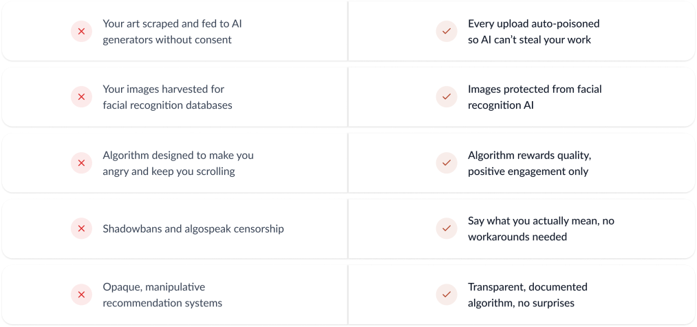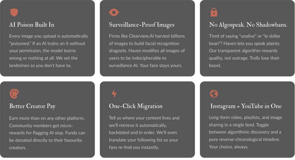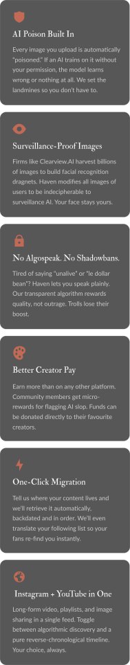 Haven is the social platform that actively sabotages AI art theft and invasive facial recognition — so you don’t have to fight alone.